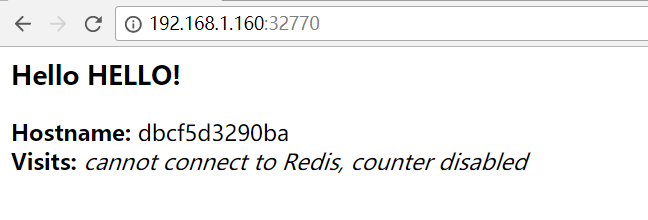 $ curl http://192.168.1.160:32770/ <h3>Hello HELLO!</h3><b>Hostname:</b> dbcf5d3290ba<br/><b>Visits:</b> <i>cannot connect to Redis, counter disabled</i>