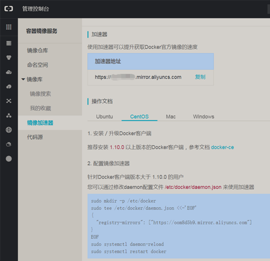 因为Docker的站点是在国外,所以做一些网络操作的时候会比较慢,我们可以配置Docker的镜像加速器,这里我们使用阿里的镜像加速器。我们可以根据下面的操作文档执行命令。