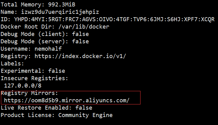 重启Dokcer之后可以使用docker info命令查看Docker客户端的信息,可以看到配置的镜像加速确实是起作用了。