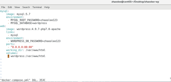 mysql: image: mysql:5.7 environment: - MYSQL_ROOT_PASSWORD=zhaoolee123 - MYSQL_DATABASE=wordpress web: image: wordpress:4.9.7-php7.0-apache links: - mysql environment: - WORDPRESS_DB_PASSWORD=zhaoolee123 ports: - "0.0.0.0:80:80" working_dir: /var/www/html volumes: - wordpress:/var/www/html