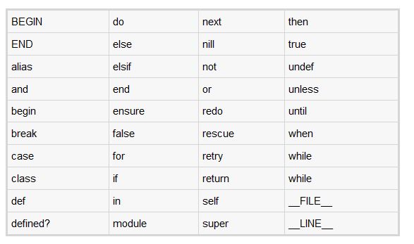 下面的列表显示了ruby的中的保留字。这些保留字不能用作常数或变量名。然而,它们可以被用作方法名。