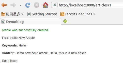 用户打开 http://localhost:3000/articles/new 发表新文章,控制器将通过 @article = article.new,基于 article 模型创建一个值为空的数据,然后传输给 new.html.erb 视图,显示效果如图 3 所示。用户在这个空的页面上填写数据,点击“create article”创建文章。文章创建成功,返回文章创建成功的提示信息和新创建文章的内容,如图 4 所示。这里看似一个简单的过程,实际上包含了将数据从表单传递到控制器,进而传递到模型完成存储的过程。