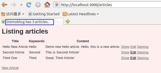 然而在某些特殊的情况下,布局需要读取一些视图的信息。以 demoblog 为例,为了能够在文章列表显示页面的标题上显示文章的总篇数,可以在 index.html.erb 末尾添加代码如清单 6 所示。