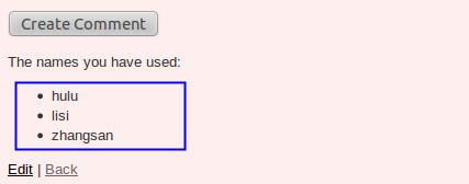 <% if @names %> <p>the names you have used:</p> <ul> <% @names.each do |name| %> <li><%=h name %></li> <% end %> </ul> <% end %>