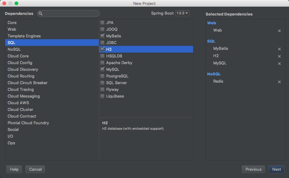 然后在选择依赖的界面,勾选Web、Mybatis、Redis、Mysql、H2:
