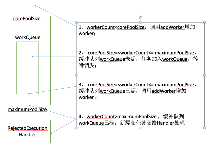 标记1对应第一种情况,要留意addWorker传入了core,core=true为corePoolSize,core=false为maximumPoolSize,新增时需要检查workerCount是否超过允许的最大值。