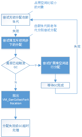 (5).若各代无法分配对象的内存,并且没有gc被触发,那么当前请求内存分配的线程将发起一次gc,这里将提交给VM一个GenCollectForAllocation操作以触发gc,当操作执行成功并返回时,若gc锁已被获得,那么说明已经由其他线程触发了gc,将继续循环以等待gc完成