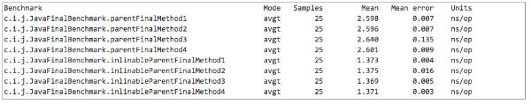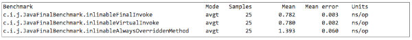 你可以在 github上查看此次基准测试的源代码。为了避免产生困惑,待会所有的结果将分块显示。最后显示的多态的基准测试是在?PolymorphicBenchmark?类中进行,其它的则在?JavaFinalBenchmark?类中。