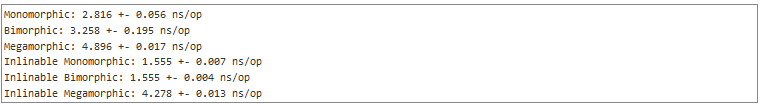 最后,我们来看涉及多态分派(polymorphic dispatch)的测试结果。单态调用的性能开销与之前virtual方法相近。但对于双态与超多状态调用,由于需要在一张较大的虚拟表上面进行查找,所以需要更多的时间。而一旦我们开启内联支持,类型分析(type profiling )将会在单态或双态的调用点启用,使得在这些调用点上的方法调用的开销减少。但与层级结构的实例一样,这只会减少少量的时间。相比而言,超多状态的实例则依旧耗时较长。记住,我并没有说在这个测试中hotspot禁用了内联,它只是没有实现多态调用点的多态内联缓存。