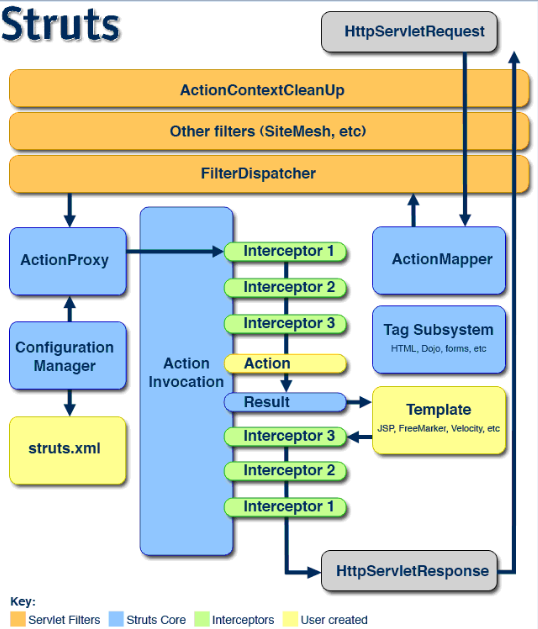 - ?客户端产生一个HttpServletRequest的请求,该请求被提交到一系列的标准过滤器(Filter)组建链中(如ActionContextCleanUp:它主要是清理当前线程的ActionContext、Dispatcher,FilterDispatcher主要是通过ActionMapper来决定需要调用那个Action,FilterDispatcher是控制器的核心,也是MVC中控制层的核心组建)。