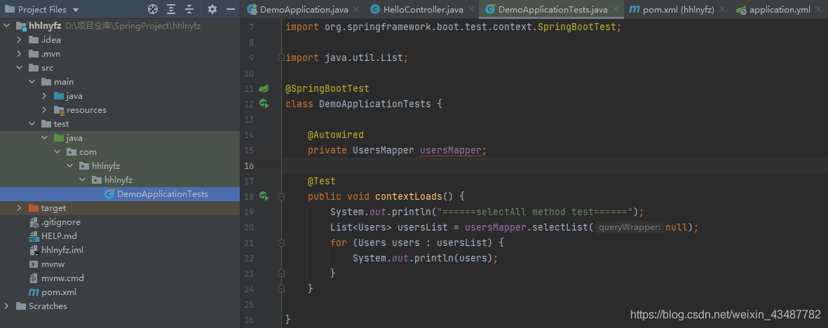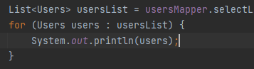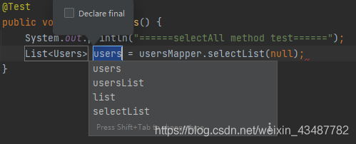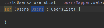 在编写代码的时候,只需要输入 usersmapper.selectlist(null).var ,然后按回车,编辑器会自动进行代码补全: