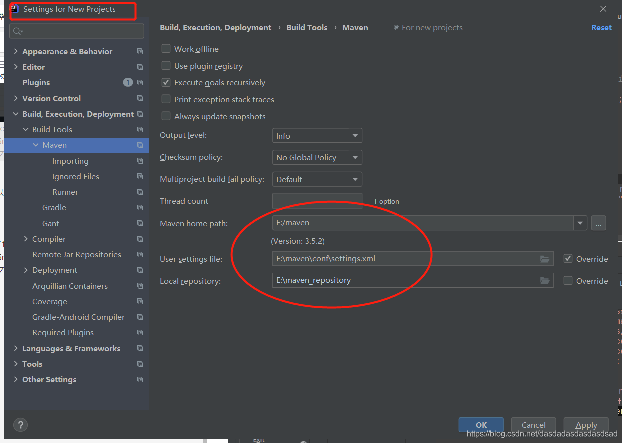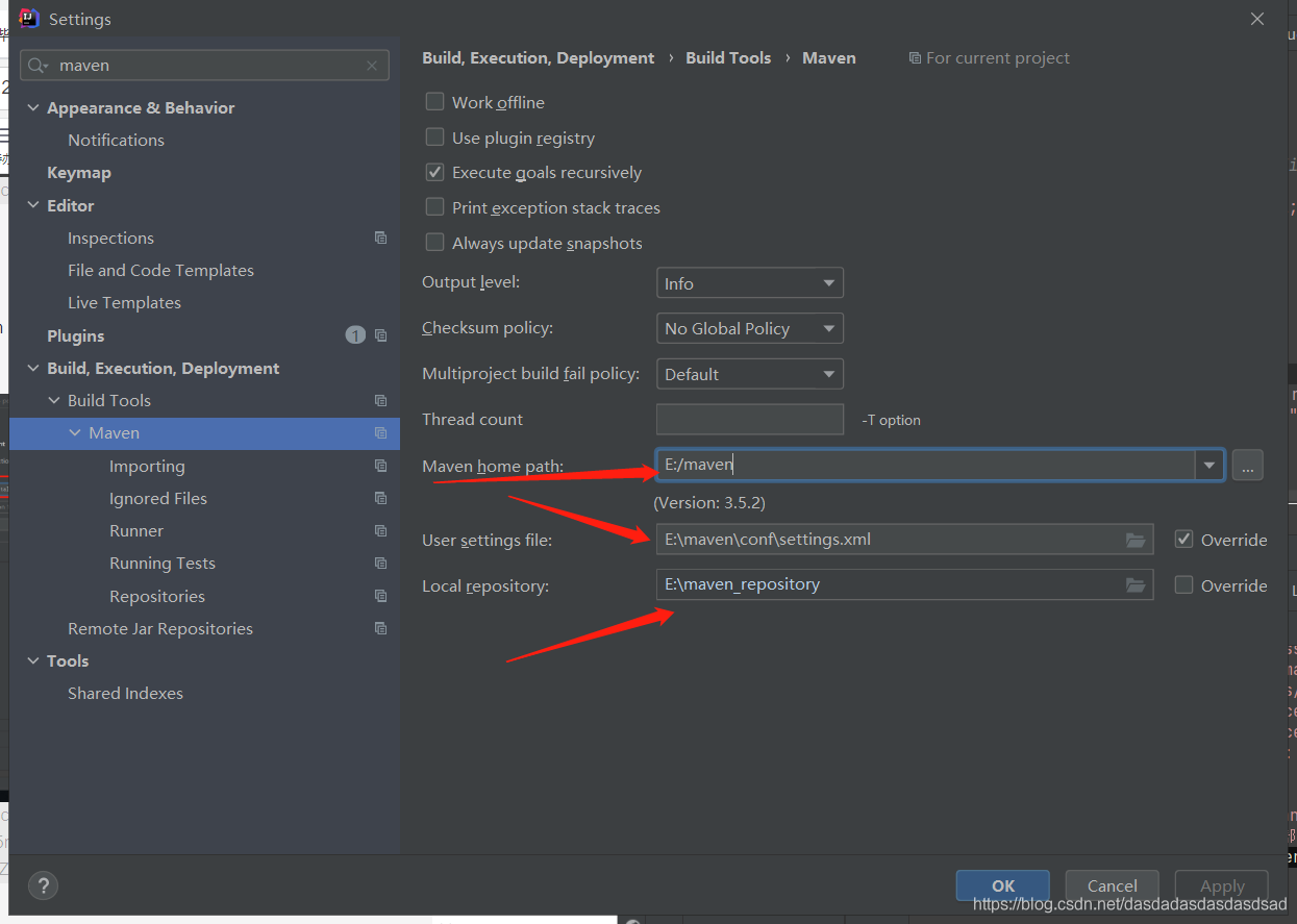 user settings file:点击override选择安装文件的maven文件夹的得conf文件夹中的settings.xml文件