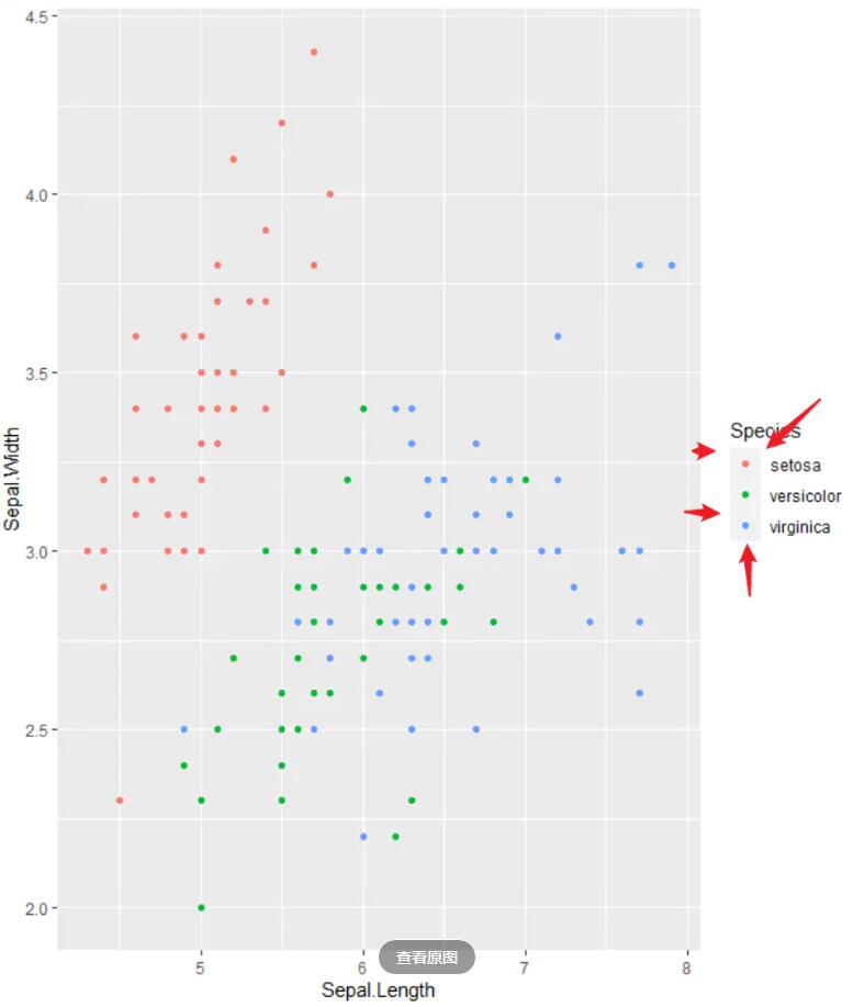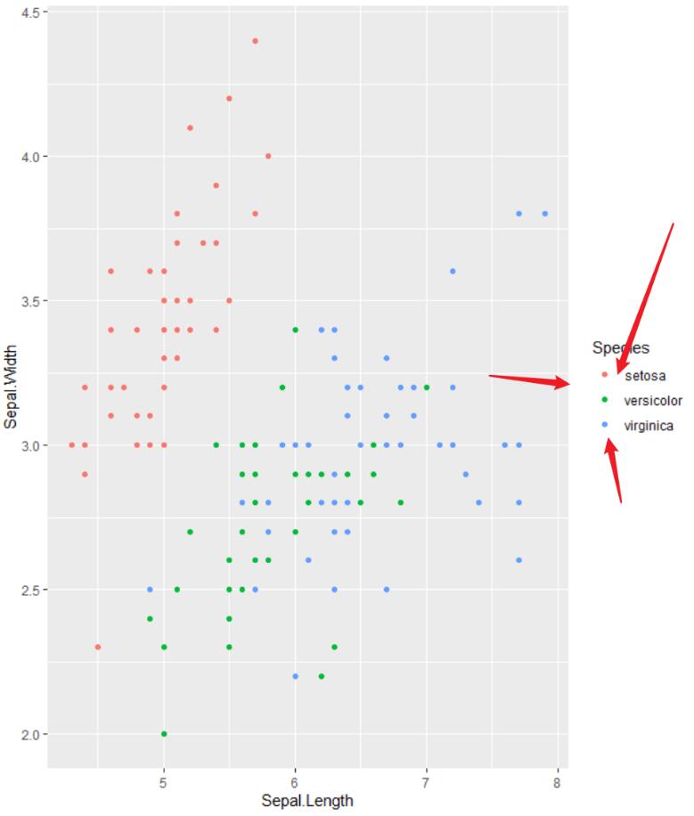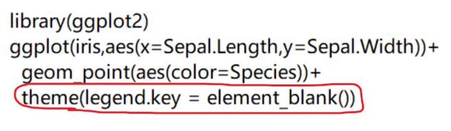 library(ggplot2) ggplot(iris,aes(x=sepal.length,y=sepal.width))+ geom_point(aes(color=species))+ theme(legend.key = element_blank())