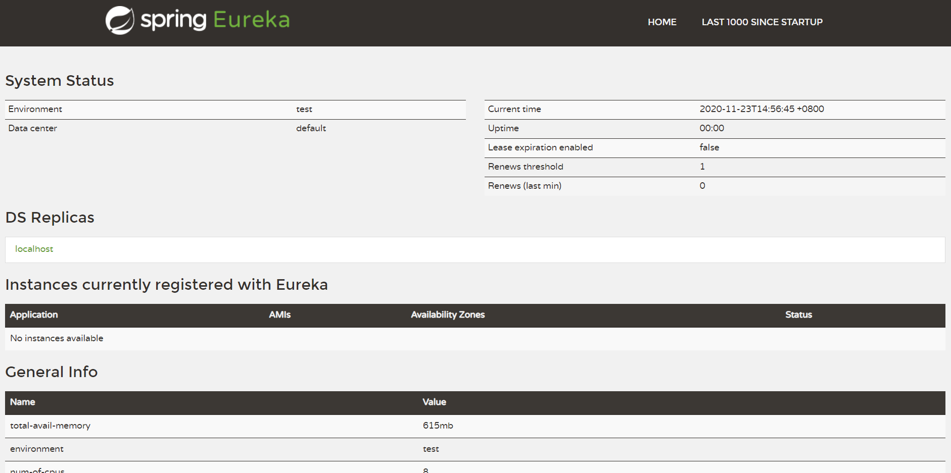 8.启动 eureka server,访问 http://localhost:8761/,如果顺利的话可以看到如下成功页面