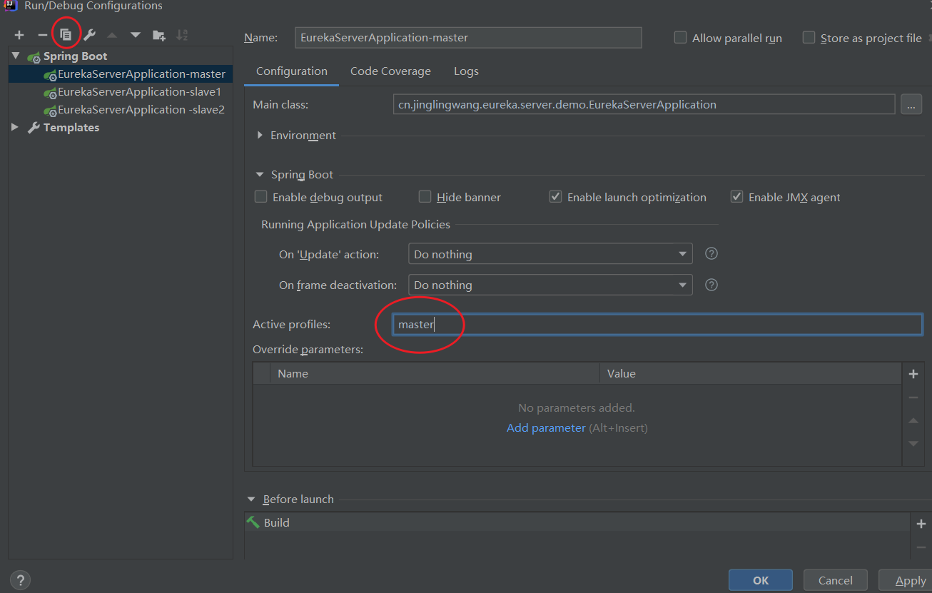 2.我们可以分别创建三个配置文件application-master.yml、application-slave1.yml、application-slave2.yml,三个配置文件除了有冲突的地方端口不一样,其他配置完全一样