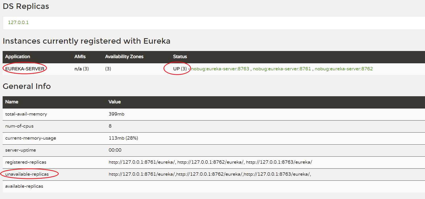 4.重新启动,访问http://localhost:8761/ ,其他两个节点君出现在 available-replicas 选项