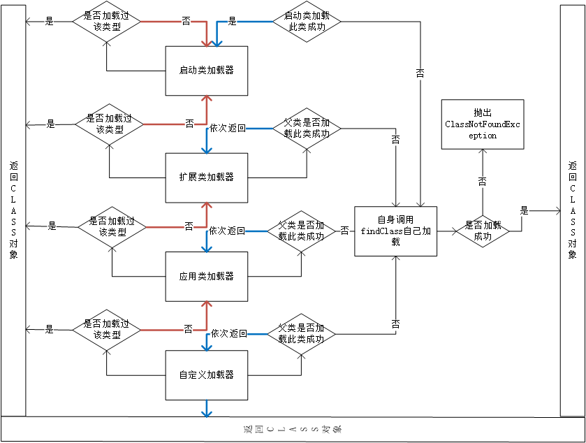 加载请求最终都应该传送到最顶层的启动类加载器中, 只有当父加载器反馈自己无法完成这个加载请求(它的搜索范围中没有找到所需的类) 时, 子加载器才会尝试自己去完成加载。