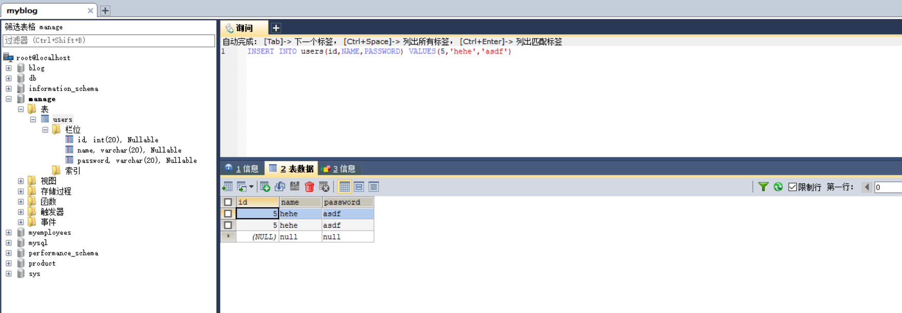 可以看到和直接使用insert语句是能达到同样的效果的,不过使用insert语句的时候,要确保已经在数据库中创建了一个叫做users的表格,以及已经有创建好了相应的列名和字段