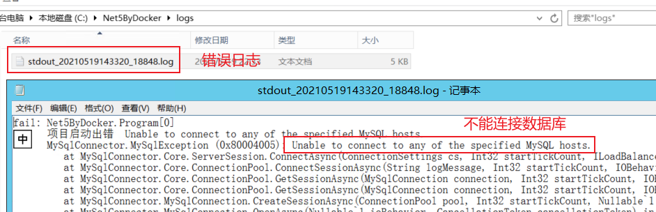 因为当前我并没有连接数据库,直接调用接口应该报错,我们看下错误日志。启动输出日志