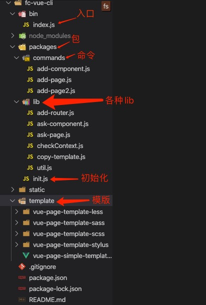 脚手架的名字定为 fc-vue,这个是通过 package.json 里面的 name 字段来定义的。