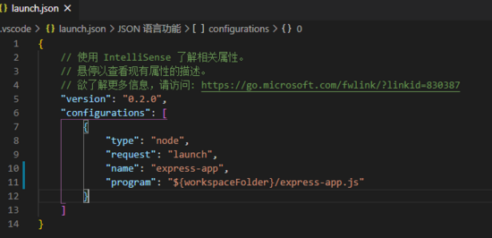 我们看到 .vscode/launch.json的configurations.program属性为 "${workspacefolder}/express-app.js" ,表示调试的入口文件,其中 workspacefolder
