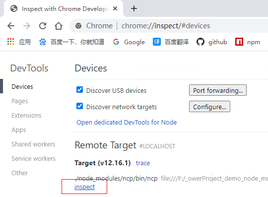 2.打开谷歌浏览器,访问 chrome://inspect/#devices ,可以看到当前浏览器监听的所有 inspect 3.点击下图红框内的超链接,会打开chrome devtools面板,就可以使用他的各种功能