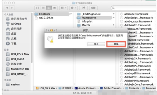 5. 然后找到contents/framework文件夹,把刚才下载并解压的破解版 amtlib.framework 拷贝进去,点“全部替换”原文件(替换前请先备份好你的原始文档amtlib.framework)