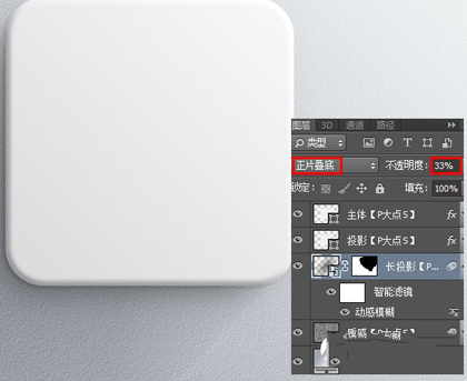载入圆角矩形的选区,在主体阴影下层新建一层,填充黑色,执行一个动感模糊,配合蒙版,我们做了一个长投影,更改图层混合模式为“正片叠底”,图层不透明度为33%。