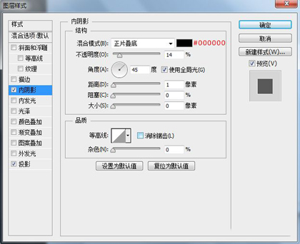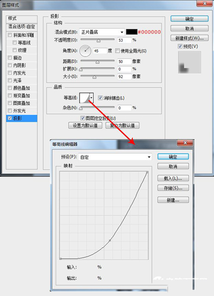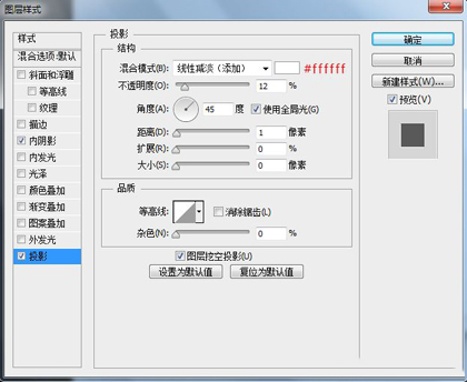 跟刚才给圆角矩形做阴影一样,复制一层,移到下层,将图层填充修改为0,添加一个投影图层样式。