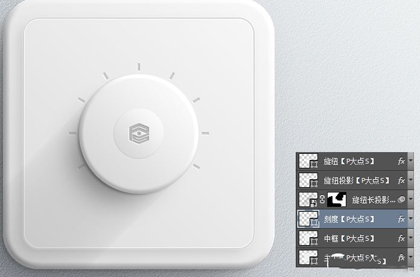 下面,我们画刻度。画个矩形,利用ctrl+alt+shift+t,得到一圈刻度。(我想这个不用解释吧),依照我们的设定,刻度应该位于旋纽的下层,因为我们给旋纽设置了投影,而阴影也应该对刻度起作用,所以我将刻度置于旋纽投影的下层,刻度颜色为#cececf,添加一个跟刚才我们给logo设置的图层样式一样的样式,黑色的内阴影,白色的投影,透明度自己把握下,我们的效果如下: