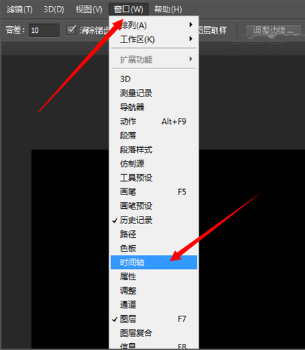12、如果没有打开时间轴的话,我们点击窗口中的时间轴在前面点击一下,把它打开。然后再弹出的面板中点击一下创建帧动画。