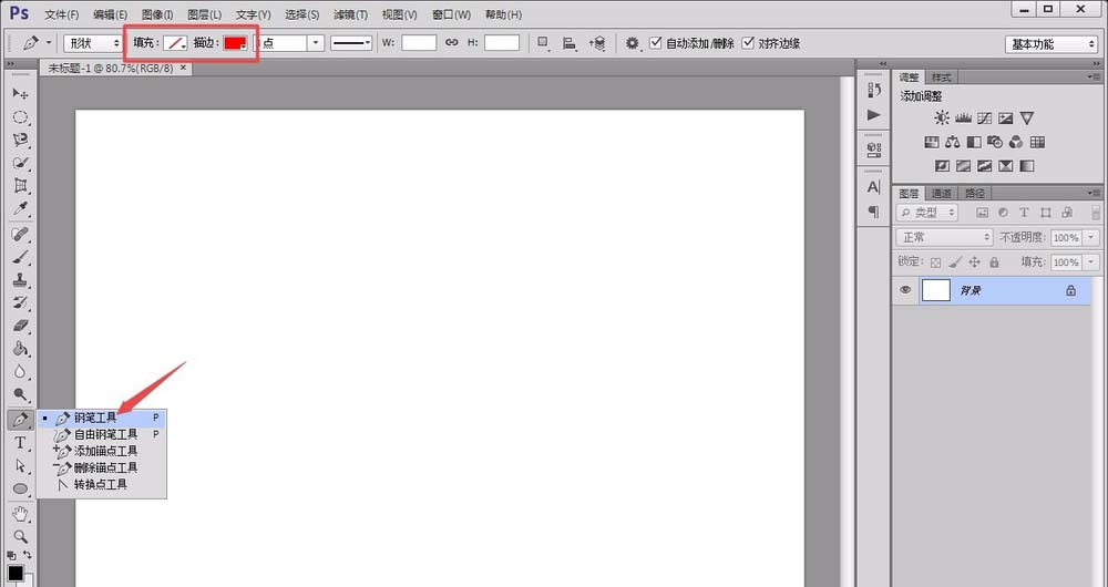 2、接着,点击左侧的“钢笔工具”,将其填充设置为黑色、描边设置为黑色,如图所示。