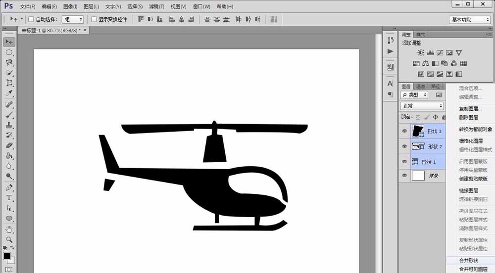 5、绘制完成后,用“shift”键选中直升机所有部件的图层,点击鼠标右键选择“合并形状”选项。