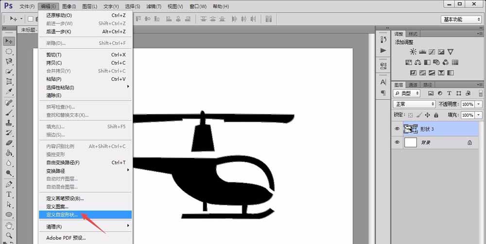 6、最后,选中合并后的图层,点击“编辑”菜单下的“定义自定形状”选项,即可完成直升机自定形状的添加。
