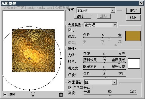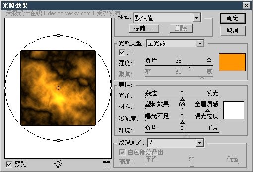 3、使用【滤镜_渲染_光照效果】,设定如下左图,颜色可选#ad8929,注意要选择纹理通道。