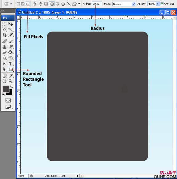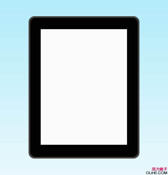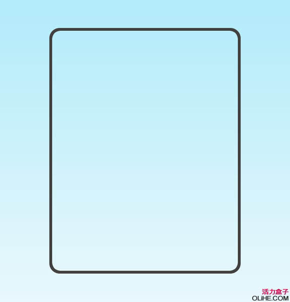 1、在photoshop中新建文件宽624px、高921px,背景色设为白色,分辨率72dpi。添加从上到下,蓝到白渐变。选择“圆角矩形工具”,圆角半径设为22px,绘制如下图所示的形状,把该图层重命名为“border”。