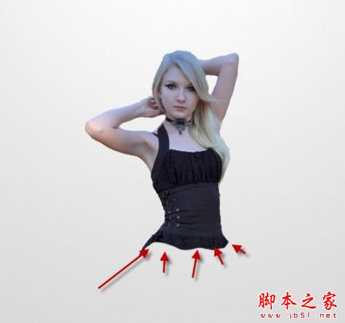 2、把模特图片拉进photoshop里面,裁剪模特的上半身粘贴到我们新建的文件里,用橡皮擦工具(调整85%的硬度,为了是边缘不至于太僵硬甚至出现锯齿)擦掉模特下半身,如图。