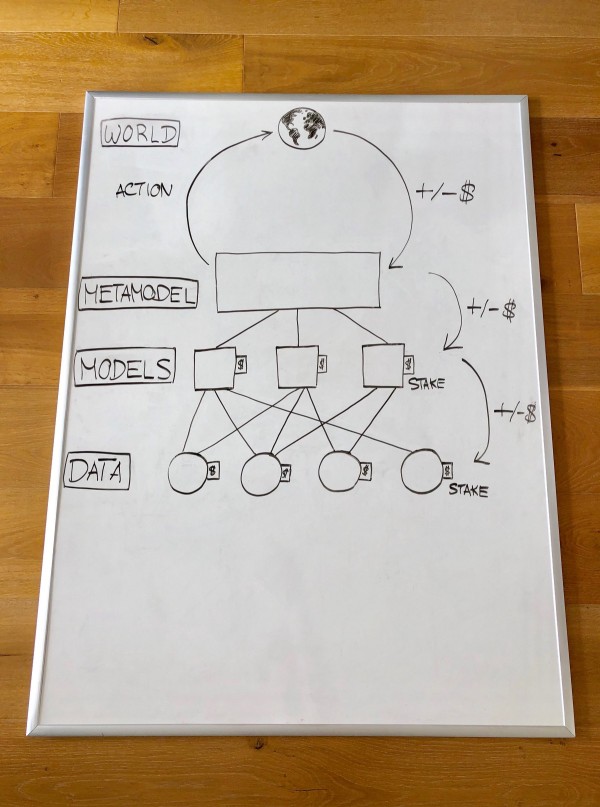 这个想法来自于2015年和来自Numerai基金的Richard之间的讨论。Numerai是一个对冲基金,它会把加密货币市场的数据发送给任何想要和做股票市场模型的数据专家。Numerai将最好的模型提交到一个“元模型“,交易这个元模型,并且支付给建立这些模型平台的数据科学家费用。