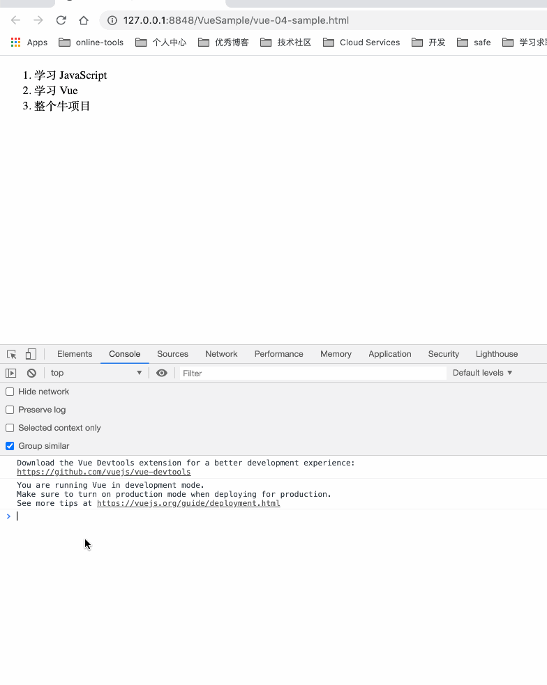 如果我们在控制台里,输入 app4.todos.push({ text: ‘新项目’ }),将会发现列表最后添加了一个新项目。