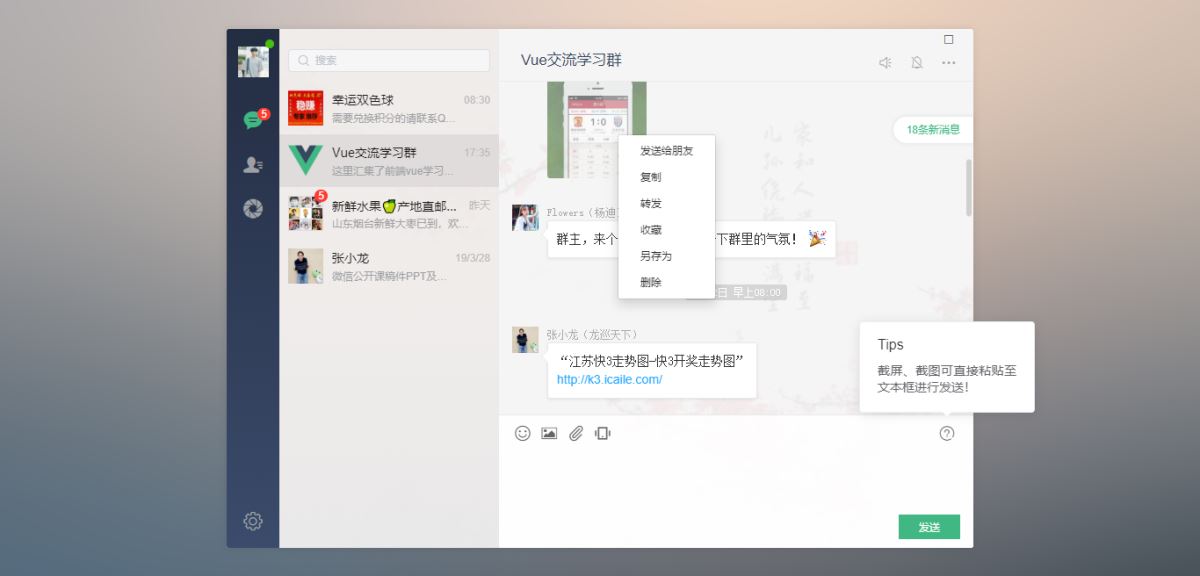 基于vue2.5.6+vuex+vue-cli+vue-router+vue-gemini-scrollbar+swiper+elementui等技术混合架构开发的仿微信web端聊天室——vuewebchat,实现了发送消息、表情(动图),图片、视频预览,右键菜单、截屏、截图可直接粘贴至文本框进行发送。