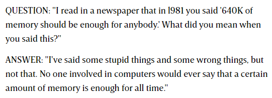 我在一份1981年的报纸上看到你说“640K的内存对任何人来说都足够了”,请问你在当时说这句话想表达什么?