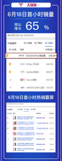 据天猫生意参谋后台数据显示,截止6月18日1时,德施曼品牌首小时销量同比增长65%,斩获天猫品牌榜第一!天猫店铺榜第一!天猫单品榜第一!其中,德施曼全自动爆款Q5、新品全自动猫眼智能锁Q5M以及3D人脸识别智能锁R7霸屏天猫单品榜前七;