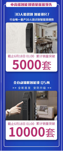 区别于低端产品低价让利带来的销量,今年618大促,德施曼中高端产品热情被全面引爆。不仅德施曼全自动爆款系列霸屏天猫单品前七位置,其中作为行业高端智能锁标杆,德施曼3D人脸智能锁R7也展现出了惊人的优势,累计销量突破5000套,遥遥领先于整个行业。