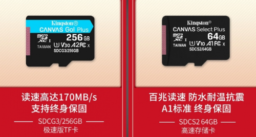 现在市场上热销的当属金士顿SDCS2(Canvas Select Plus系列),拥有百兆读取速度,防水耐温抗冲击,适合任意数码产品,手机扩展卡,记录仪等等都适合;高性能的存储卡当属新品SDCG3(Canvas Go!Plus系列),最大的特色就是快,拥有高达170MB/s的传输速度,支持A2应用性能等级,可广泛应用于各类安卓产品或者游戏机,确保畅快运行不卡顿。