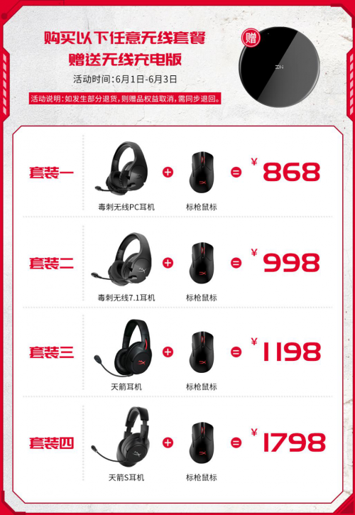 除此之外,还有四组空前好价的无线套装可以重点关注一下,6月1日-3日,购买HyperX耳机+鼠标超值无线套装,还将获赠无线充电板。