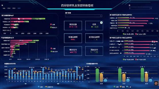 通过可视化销售看板,展示羊奶粉事业部和牛奶粉事业部的实际销售金额、件数、吨位等核心KPI指标。仪表盘显示销售任务完成率。分析各业务员销售额排行Top5,存货分类月销售额Top10,运营部销售额分布,月度累计销售年对比,年累计销售日对比等。