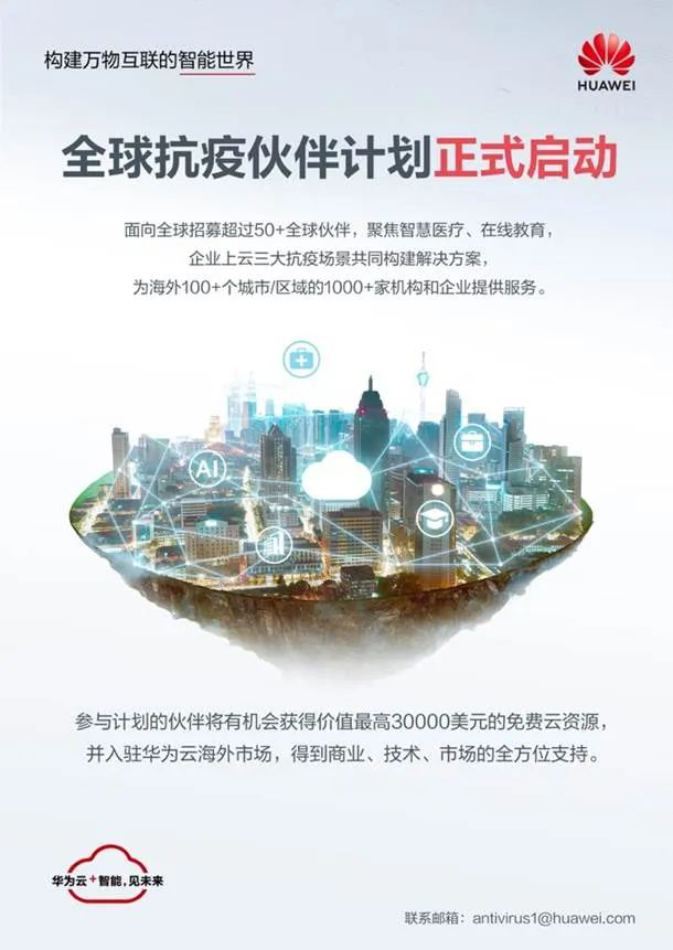 同时,华为云还发布了“全球抗疫伙伴计划”,聚焦远程办公、AI抗疫、企业协同、智慧医疗、在线教育五大场景,面向全球招募合作伙伴。参与计划的伙伴将获得价值最高30000美元的免费云资源,并入驻华为云海外市场,得到商业、技术、市场等全方位支持。