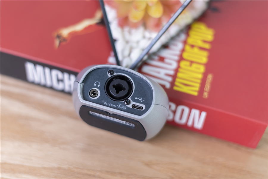 在机身的背面,我们可以看到三个接口,中间直接连接麦克风,左侧是连接耳机可以直接进行监听,而右侧则是一个Micro-USB的接口,我们可以通过这个接口连接上手机、笔记本PC等设备。另外舒尔MVi底部也有防滑垫,放在桌子上也不用怕会轻易移动以牵扯到线材。