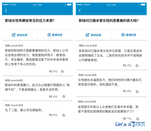 在“职场对已婚未育女性的恶意真的很大吗?”话题下,身为HR的一位领英会员表示,“其实职场对已婚未育女性并无恶意,只是生育成本全部转嫁给了企业,二胎四年的成本并不是每家公司都能承担。”另一位女性会员回应道,“女性被社会逼到后方,我们的时间与精力看似与男性是对等的,但机遇却不是。”一位自称“职场小白”的年轻会员发言道,“发现我司中层以上女老板们多是中年未婚,我是不是现在就得想好要前途还是要孩子了?”