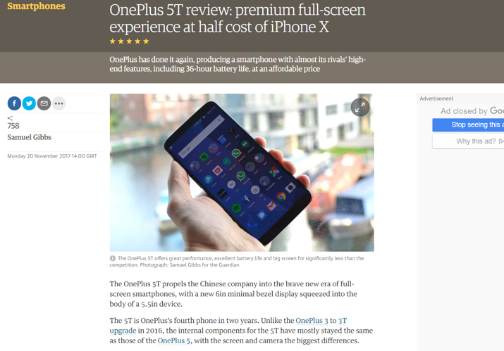 《卫报》给一加5T打出了五星满分好评。